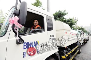 這次婚車創(chuàng)意,并不出自新人和婚慶公司,而是來自新娘的公司。這家民營企業(yè)承包了南濱路的道路保潔,這12輛灑水車是公司去年剛購置的,發(fā)喜糖時,公司老總突發(fā)奇想,要用公司的灑水車緊跟婚車隊伍,表示祝福。