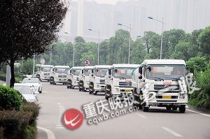 灑水車車隊負責人叫楊曉妮,她說這12輛灑水車是來迎親的,大家提早進行了打扮,將灑水車清理干凈,化上妝。